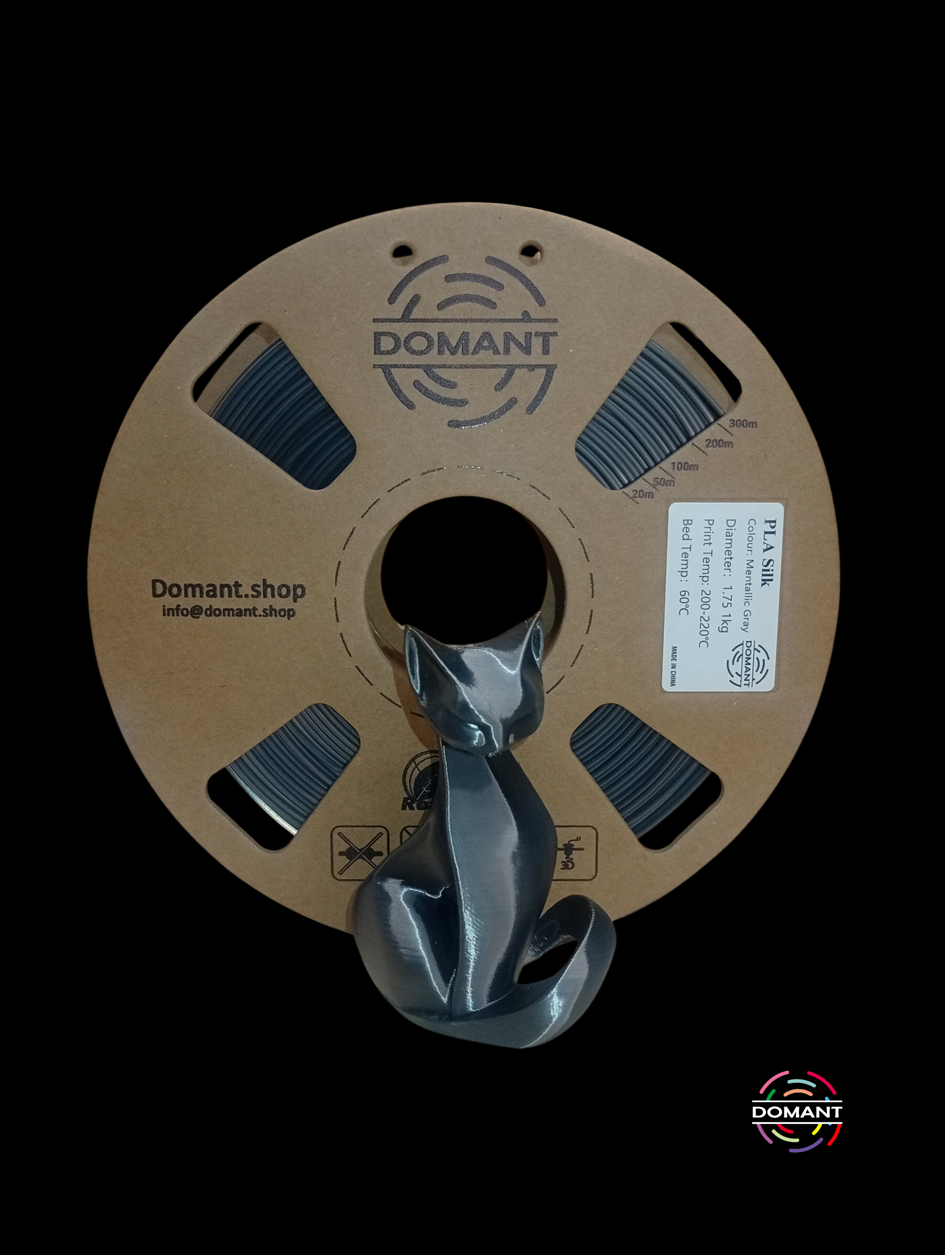 PLA Seda Gris Metálico – Domant Gris metálico con efecto seda premium – un tono plateado oscuro y sofisticado que reluce como acero pulido. Brillo sedoso, capas invisibles y tacto de lujo. Ideal para miniaturas tecnológicas, joyería moderna, adornos futuristas o accesorios de alta gama.